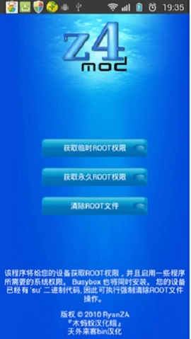 1、主界面:z4root的主界面设有“获取临时根权限”“获取永久根权限”“清除根文件”三个选项,用户能够依据自身需求从中挑选。