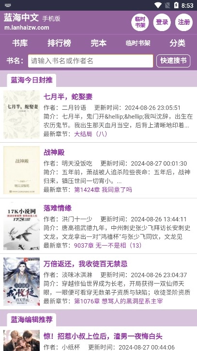 蓝海搜书平台拥有海量小说资源,各类题材应有尽有,能为用户提供专业的小说搜索功能,助力用户快速定位所需的小说内容。平台内阅读资源丰富多样,致力于为用户打造专属的优质小说阅读体验。