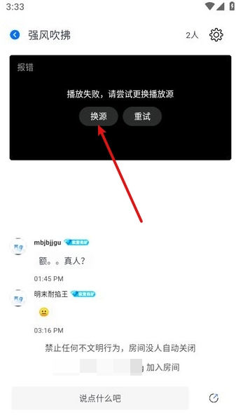 4、最后还能加入他人创建的房间一同观看,要是出现图中提示的播放失败情况,点击“换源”切换播放源就能继续观看了。