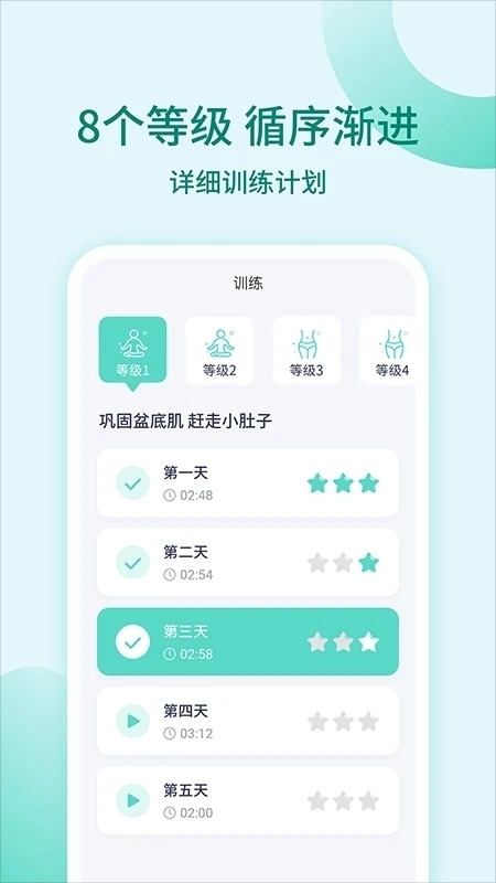结构化课程:提供从入门、进阶到强化的系统化课程包,每个课程包含多次收缩与放松的循环,并配有语音引导和动画示意。