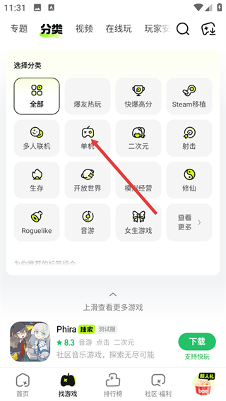 1、在首页点击底部【找游戏】,进入游戏分类页面,可按分类筛选目标游戏。