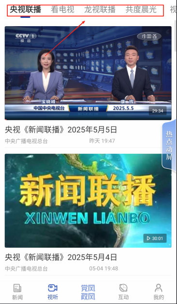 4、针对视听爱好者群体,首页的视听标签板块内整合了央视联播、龙视联播等视频资源,用户只需轻点相应入口即可直接观看。