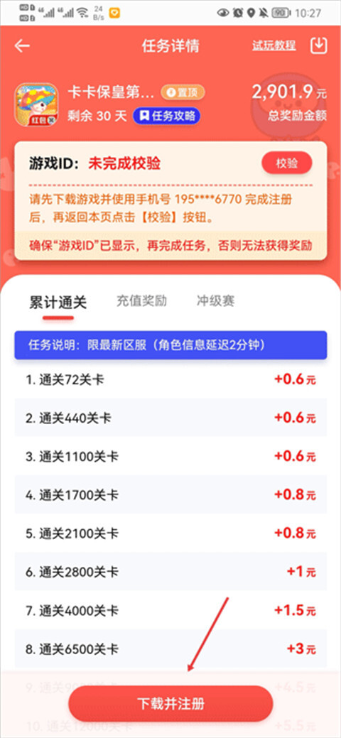 3、完成游戏下载并注册账号后,回到试客的游戏任务详情页面进行校验。校验通过且确认游戏id已显示后,就能开始执行游戏任务;若校验未通过或游戏id未显示,则无法获取相应奖励。