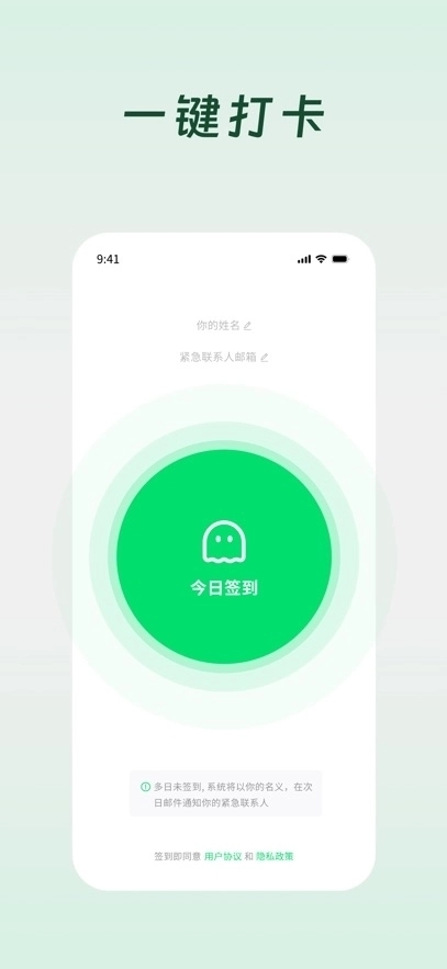 极简设计理念:界面仅包含签到按钮与紧急联系人设置入口,操作门槛极低,用户无需注册即可使用。