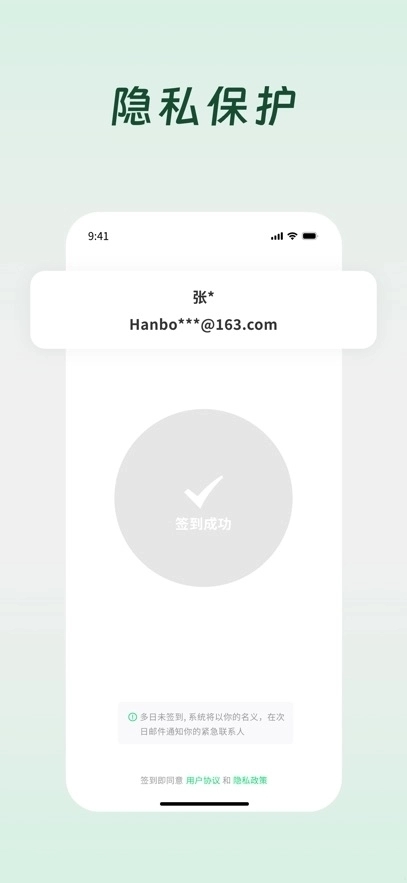 操作流程:用户首次使用时需填写紧急联系人的姓名与邮箱,之后每日打开应用点击签到按钮即可完成操作。若连续两天未签到,系统将于次日自动发送预警邮件。