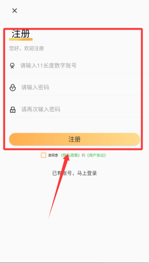 1、先输入手机号填上密码再次确认密码然后点击注册按钮。