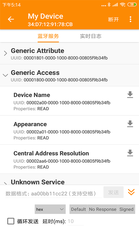 设备连接:支持快速连接目标设备,并自动枚举服务与特征值。