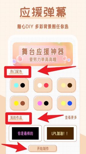 2、开启弹幕功能后,用户能够对文字和背景进行个性化DIY设计,该功能支持热门配色选择、个人作品管理以及一键生成弹幕大屏等操作。