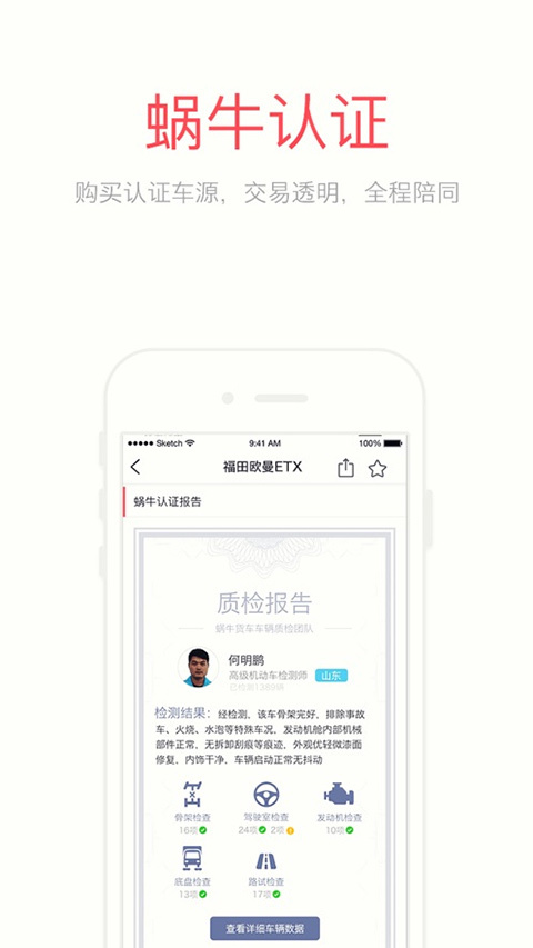“蜗牛认证”车况保障:核心功能,平台对车源进行专业检测(发动机、变速箱、底盘、车身结构、事故排查等),生成详细检测报告,对无重大事故、无火烧、无水泡、关键部件完好的车辆授予“蜗牛认证”,提供车况保障。