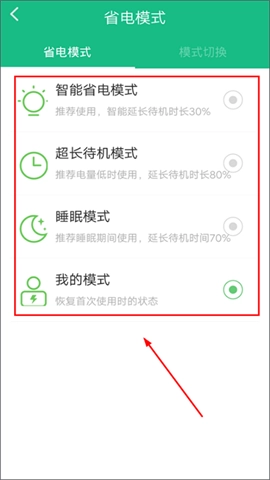 2、在“模式”页面中,点击“省电模式”。用户可以根据手机当前的电量情况,手动选择适合的省电模式。