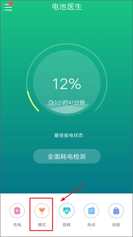 1、并打开金山电池医生最新版,点击首页下方的“模式”选项。