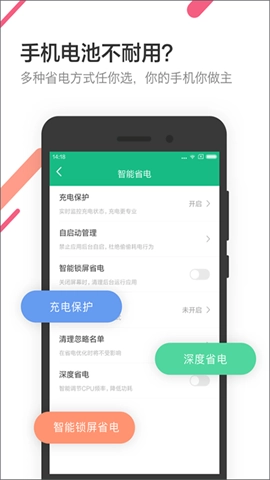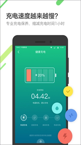 1、金山电池医生的设计初衷,是为用户打造一套全方位的电池管理方案,其中包含功耗评估、优化配置等功能,只需一键操作就能关闭耗电应用,让您不必再为手机电量突然耗尽而忧心,可尽情享受流畅的使用体验。