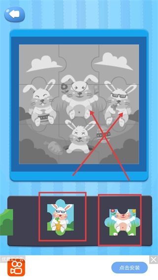 3、观察拼图界面里的兔子样式,把下方红框内的对应兔子拼图块,拖到箭头所指的匹配位置,推进拼图拼接进度。