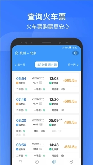 购票与行程管理:支持12306账号登录,实现车票查询、购买、改签、退票。自动导入或手动添加行程,生成电子行程单。